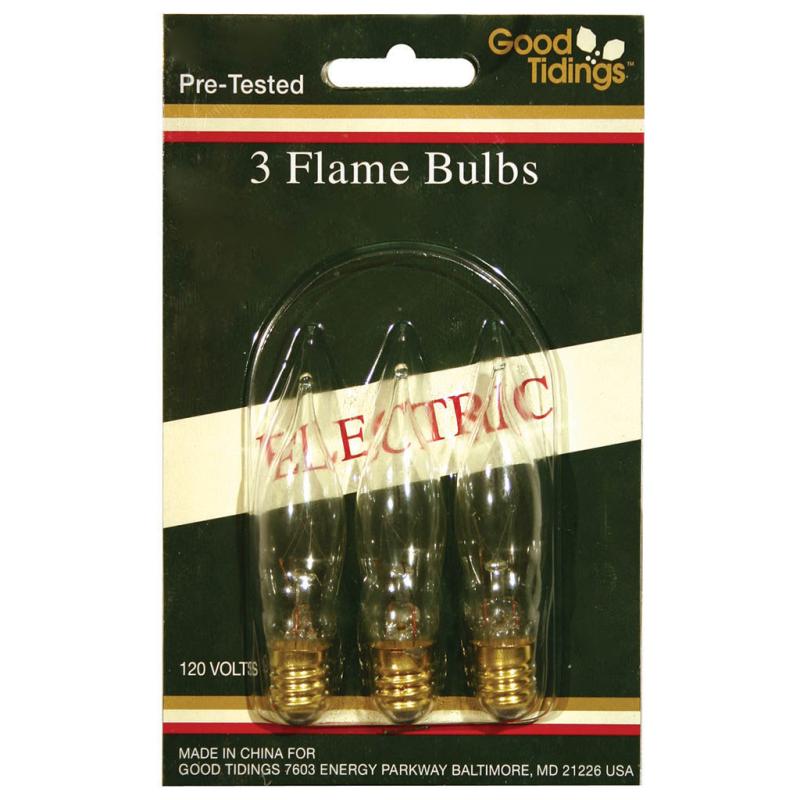 Electric candle replacement bulbs that flicker. Three flame bulbs per card. 120 volt.