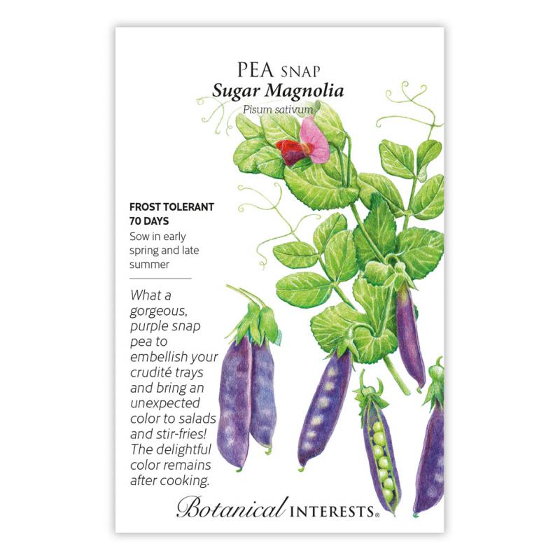| Wow, a purple snap pea, tender and delicious! 'Sugar Magnolia' isn't just a famous Grateful Dead song, it is also a beautiful, fine-flavored, edible-pod pea with purple flowers. Long hypertendrils (vigorous, multi-branching tendrils) act as extra sturdy supports for 6'-7' vining plants, creating an airy structure that helps prevent mildew. Some of these open-pollinated peas may be speckled with green, or be fully green. |