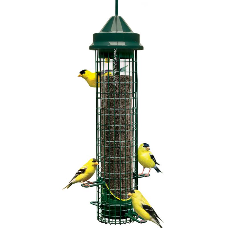 | Nyjer feeder with 4 clinging ports and 4 perching ports. Guaranteed squirrel proof! When a squirrel climbs onto the feeder, its weight automatically forces the shroud down, closing the seed ports. Dismantles for easy cleaning. The patented seed tube ventilation system in Squirrel Buster Finch Feeder permits humidity and warm air to escape through vents at the top of the feeder. The escaping air is replaced by fresh air entering through the seed ports. The seed remains fresher and attracts more birds. |