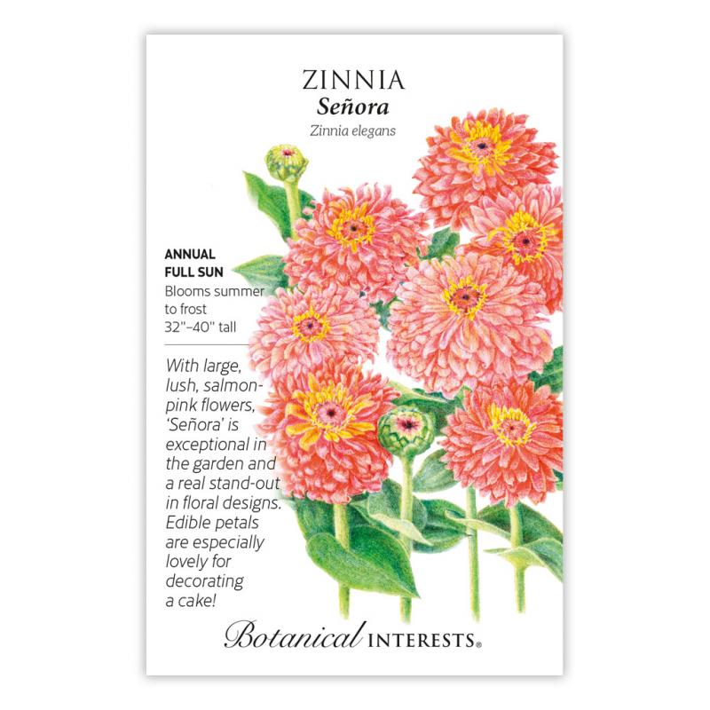 | Whether you are adding to your pollinator garden, flower garden, or cutting garden, 'Señora' is a distinguished addition. The double 3"—5" flowers on strong, long stems are elegant, and salmon-pink is a dreamy, rare color in the garden. As a bonus, zinnia petals are edible and look adorable as a topper on salads or baked goods, and flowers dry well for endless craft uses, like dried arrangements or homegrown potpourri. Deer resistant. |