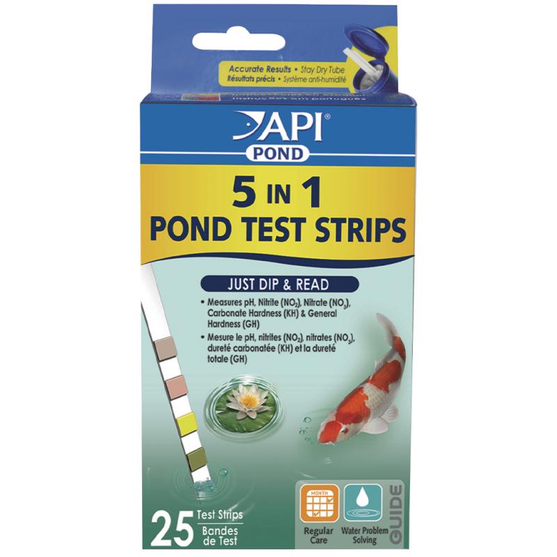 Description: This complete pond test kit measures the most important levels, including pH, Nitrite, Nitrate, Carbonate Hardness, and General Hardness to maintain ideal water condition. Inside the box you'll find 25 test strips in a snap-tight tube and a color chart. Just dip and read! This box contains enough water testing supplies for 25 tests.