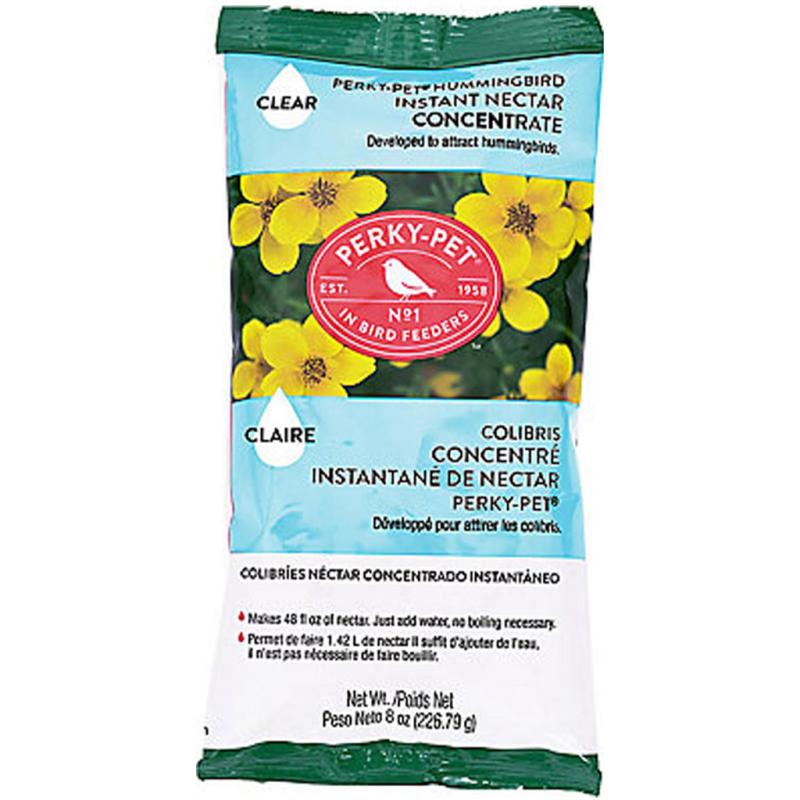 | The Perky-Pet Original Instant Nectar is made of 100% sucrose, which provides the highest amount of energy to hummingbirds. This hummingbird nectar concentrate is so easy to use- simply stir in water. No artificial color or sweeteners added. No boiling required. 8 oz. makes 48 oz. |