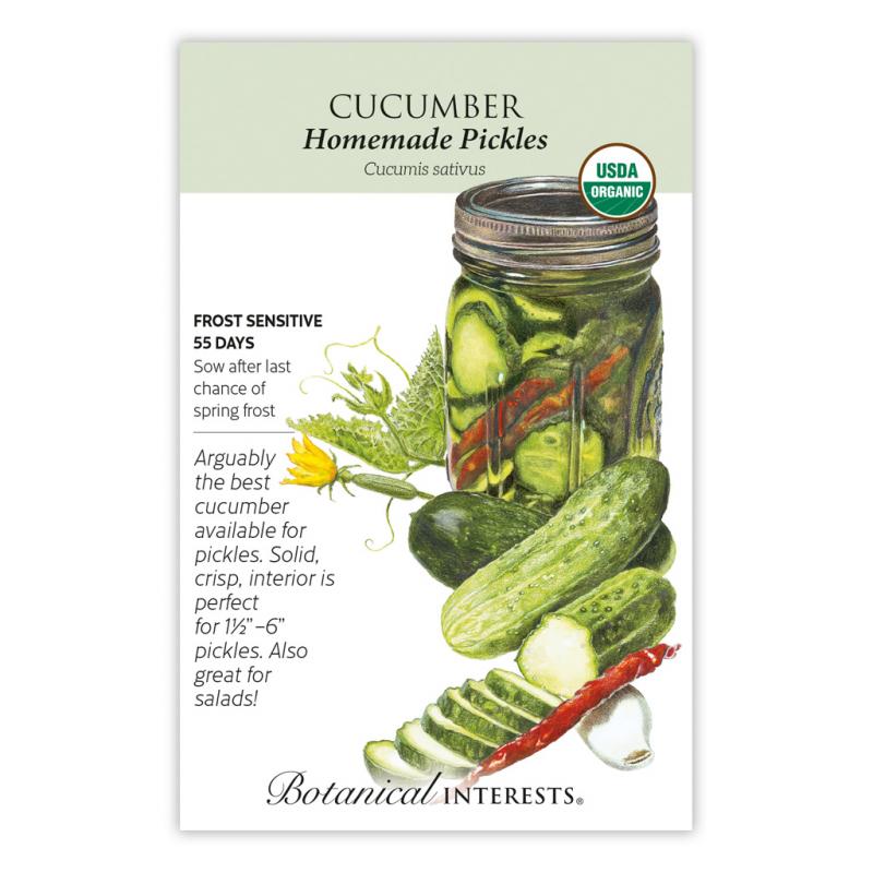 | Making pickles at home is easy with 'Homemade Pickles'. This plant has very high yields, and is ready to harvest early; pick anywhere from 1½"–6" long. They have the perfect interior texture for pickles, but can also be eaten fresh. The 4'–5' compact vines are great in containers. Disease resistant. |