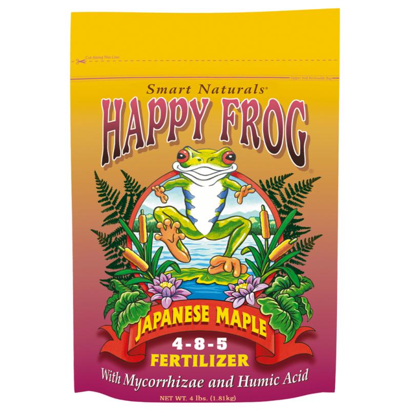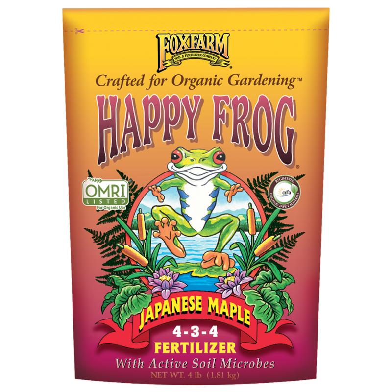 Description: Encourage Crowning Glories in Your Garden!. 4-3-4. Happy Frog Japanese Maple Fertilizer is specifically formulated for use on Japanese maples, lilies, evergreens, hydrangeas, junipers, dogwoods, flowering ornamentals, and other low pH feeders. This unique blend of fertilizers and microorganisms delivers nutrition where your plants need it most. Contains phosphorus and potassium to support the needs of these beautiful trees. Mycorrhizal fungi are included to help increase root efficiency, which may enhance nutrient uptake and water absorption. OMRI Listed and Registered CDFA Organic Input Material.
