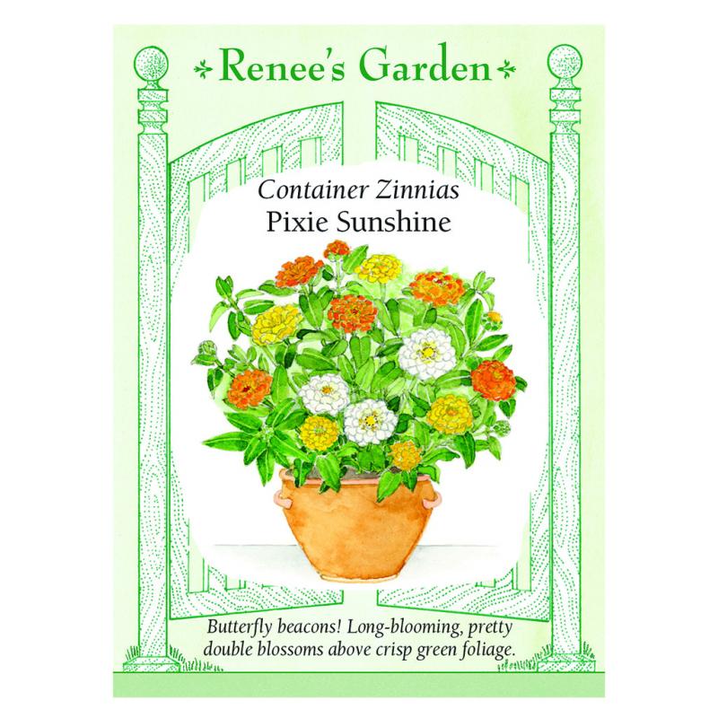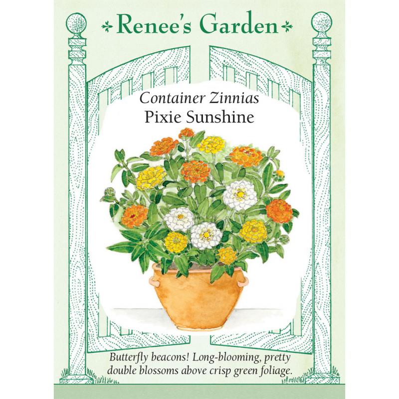 | (Zinnia elegans) Our exclusive color combo of these easy care, 8 to 12 inch zinnias offers a sparkling trio in perfectly matched shades of rich buttery yellow, citrus orange and white. Pots of Pixie’s rounded, fully double 2 to 3 inch blossoms shine above crisp green foliage to brighten bare corners or add cheerful color to a front porch or walk or backyard patio garden. Summer butterflies will delight in petite Pixie Sunshine's nectar and long bloom. |