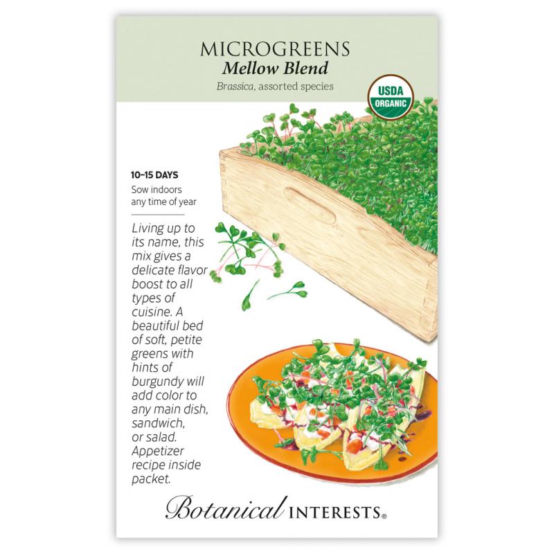 | Add a fresh accent of flavor and color to hors d'oeuvres, sandwiches, and salads! Mellow Blend microgreens can be grown indoors at any time of year and are a nutrient-packed way to get your "green fix" in the dead of winter. Move containers as needed for best light exposure and temperature. Harvest when first leaves appear and enjoy! Mix includes: 25% Mizuna mustard, 25% broccoli, 20% kohlrabi, 15% Tatsoi bok choy, 15% Red Acre cabbage |