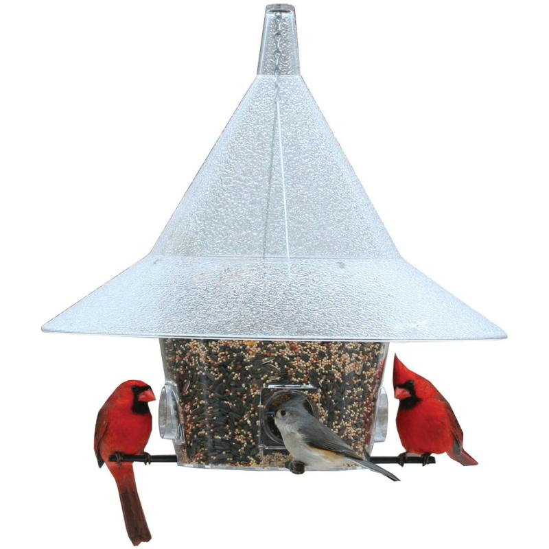 | Seed ports are designed for the peck & pull activity of desirable song birds-dramatically reducing seed loss. / Medium-length perches discourage visits by larger birds. It's even pigeon-proof! / Proudly made in the u.s.a., this bird feeder has a lifetime warranty against squirrel damage. / The large 17-inch diameter squirrel-proof dome protects seed from both rain and snow. / The clear-view, easy-flow seed chambers let birds effortlessly dine from their perch. / Spacious, easy-to-fill bucket means fewer refills and more relaxing bird-watching. |