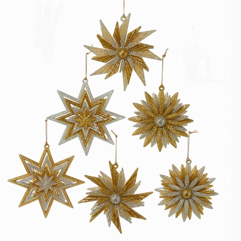 | Add some sparkle to any holiday décor or Christmas tree with these gold and silver sunflower and snowflake ornaments by Kurt Adler. Each ornament features a shimmery glitter design. This gold and silver assortment includes a sunflower, pinwheel snowflake, and star snowflake design. |