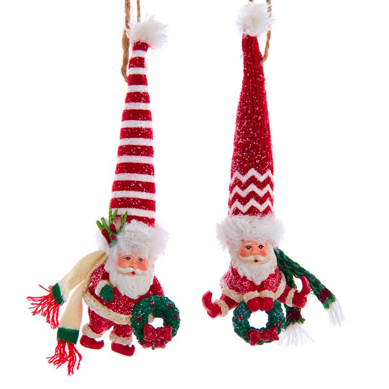 Description: These Kurt Adler Santa ornaments are a fun and festive addition to any holiday décor or Christmas tree. This assortment features a standing Santa with an oversized red and white striped knit long hat and a white scarf and a jumping Santa with a red and white knit long hat and a green scarf.