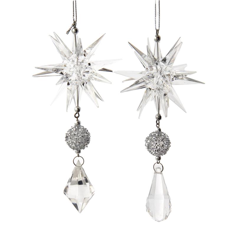 | Kurt Adler's clear and silver dangle ornaments are a festive addition to any holiday décor or Christmas tree. This assortment features two clear starbursts with a silver bead and either a drop-shaped or diamond-shaped dangle. |