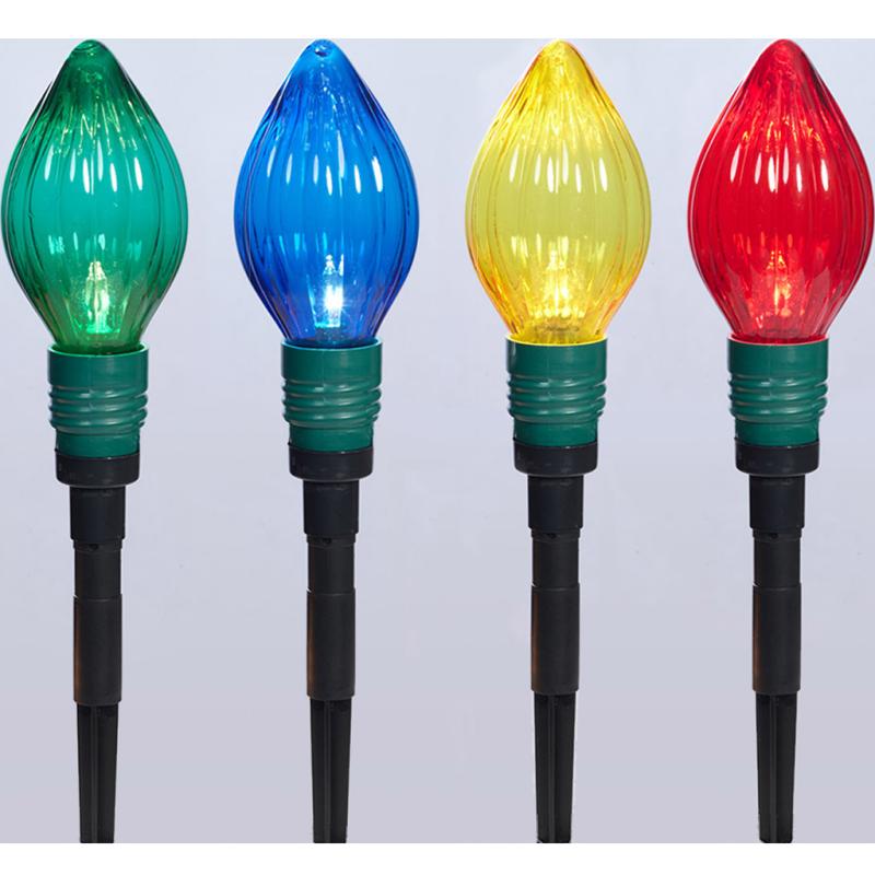 Description: The lighted lawn stakes have ten jumbo clear bulbs for Indoor and outdoor use. They are perfect for decorating lawns, pathways, and driveways. The steady-burning ten bulbs are pre-attached and have a total lighted length of 7.7 feet and 9 feet. They are UL-listed.