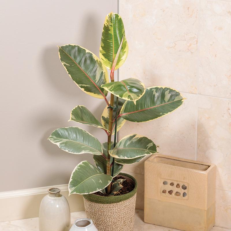Features: This striking Rubber Plant has stunning, variegated, multi-colored leaves. The leaves are green and yellowish-cream, with touches of pink.