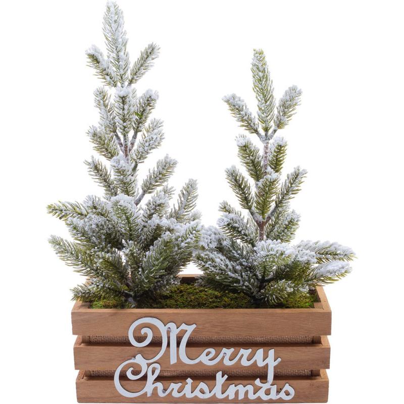 2 Snow covered trees in wooden crate with "Merry Christmas". 16"H X 14"W X 4"D