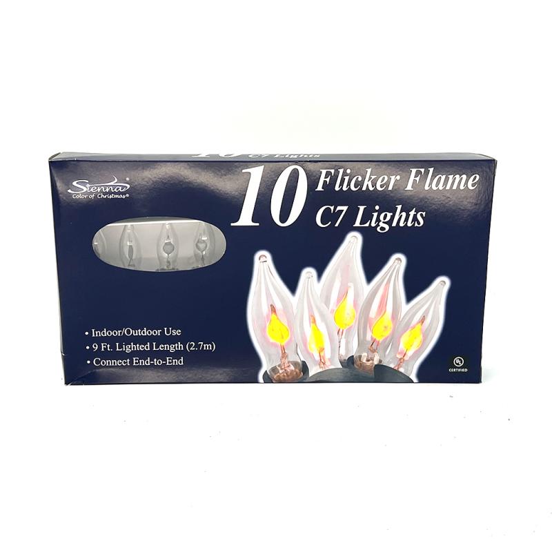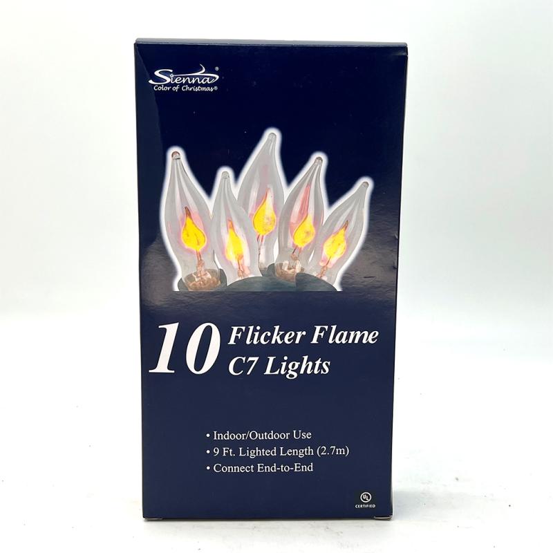 C7 lights with a Flickering Flame inside. A flickering element inside each bulb is designed to flicker on and off, creating a flame-like appearance. Pre-tested. Indoor use only. Cool burning. UL listed.