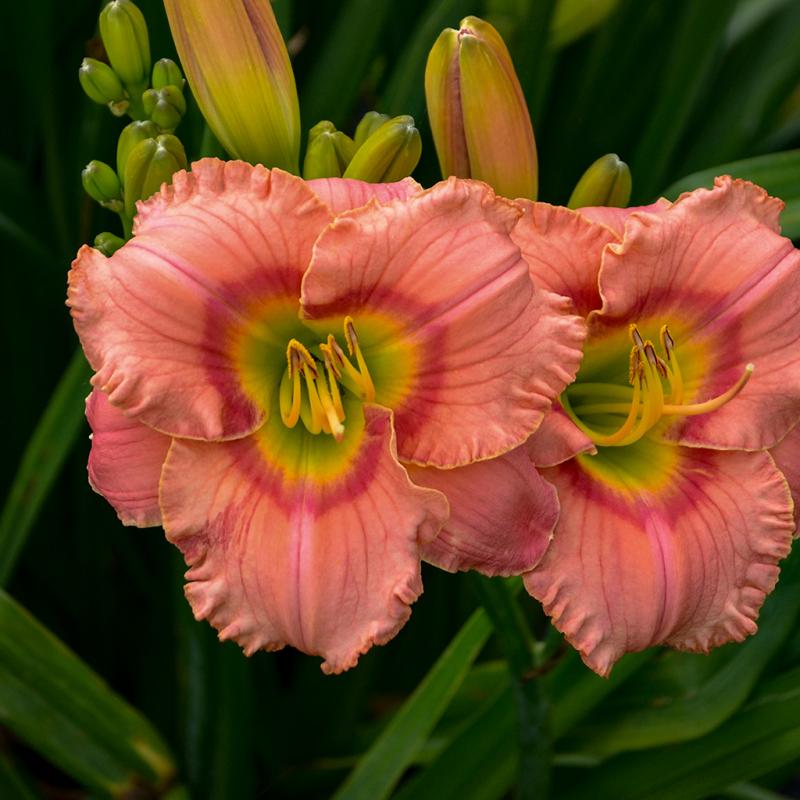 | 4¼", medium pink flowers with a triangular red eye and a green throat Blossoms are round in form and heavily ruffled The flower color is sunfast Strong, well-branched, and budded scapes Notably fragrant Healthy, deep green foliage |