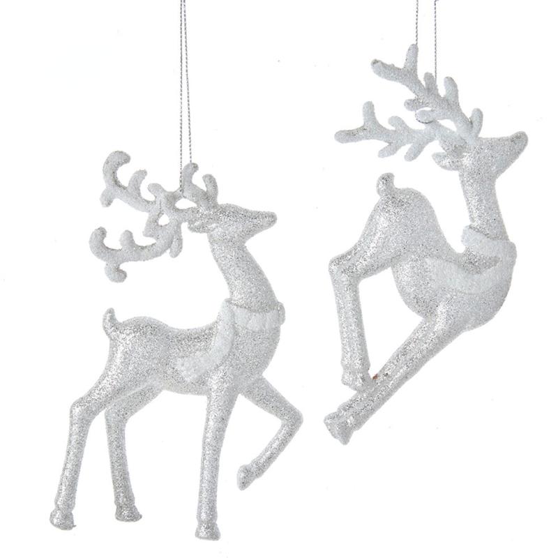 Description: Kurt Adler's silver and white glittered reindeer ornaments are a festive addition to any holiday décor or Christmas tree. This assortment features two glittered reindeer ornaments, one in a standing position and the other in a leaping position.