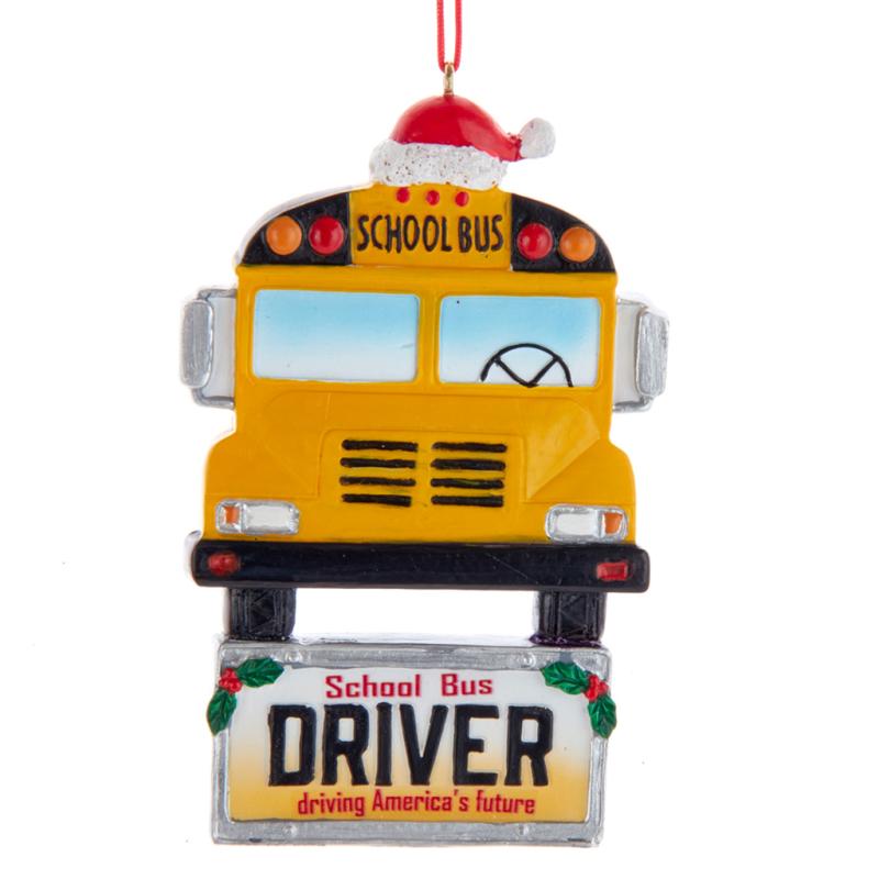 | This "School Bus Driver Driving America's Future" ornament from Kurt Adler is a festive addition to any holiday décor or Christmas tree. It features a yellow school bus with a red and white Santa hat. |