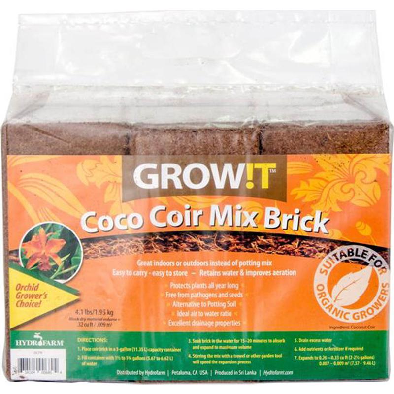 | Give your plants a sturdy growing structure with GROW!T's CoCo Coir Bricks. Now available at Hydrofarm, CoCo Coir Bricks support your plants all year. The bricks, available in a mix or chip format, do double duty: they retain water, making sure plants never go thirsty, but due to their texture, they also offer excellent drainage properties. GROW!T's ideal consistency gives plants room to breathe and for roots to grow freely, capturing that essential air-to-water ratio for your biggest growth yet. Implement this pathogen-free media to your potting soil or in place of bark as an attractive and all-natural ground cover. Each brick expands to 0.26-0.33 cu—ft. (22.5 gal) of wetted coir. |