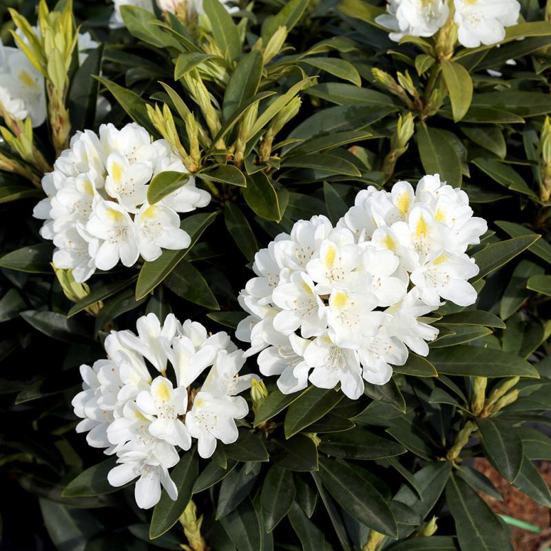 Description: A late to mid-season bloomer with large, rounded trusses, each holding a dozen or more clear white bell-shaped flowers with yellow dorsal blotches. The compact, dense form is wider than tall, with an excellent even growth habit. Exhibits good sun tolerance. Outstanding for use as an informal hedge or foundation plant. It is an evergreen shrub.