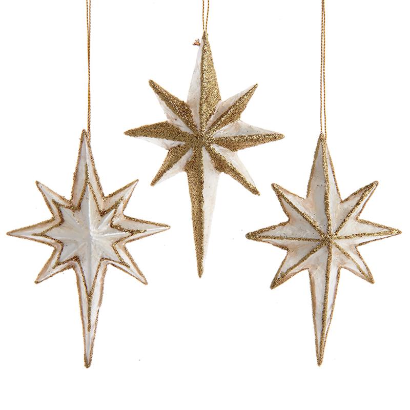 | Kurt Adler's Capiz laminated ornaments are a festive addition to any holiday décor or Christmas tree. This assortment includes three Capiz Bethlehem star ornaments, each decorated with a unique gold glitter design. |