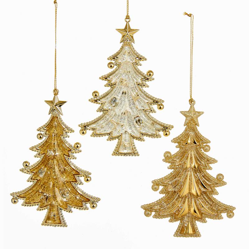 Description: Decorate your tree with these gold glitter Christmas ornaments from Kurt Adler. This assortment features three gold-colored Christmas trees and comes in light gold, dark gold, and gold designs.