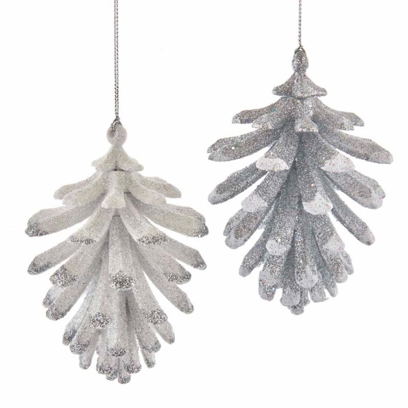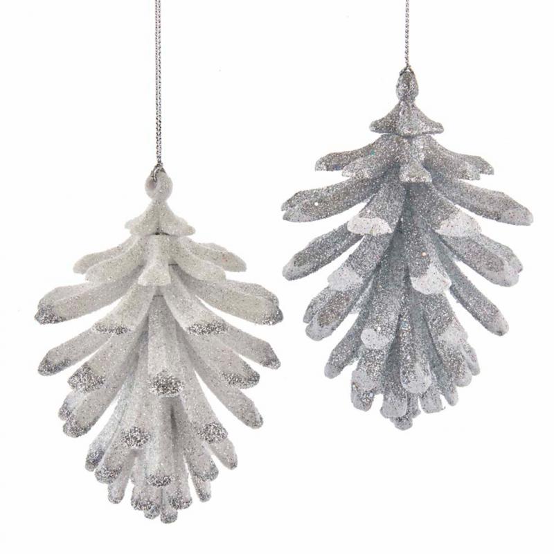| Kurt Adler's silver and white pinecone ornaments are a festive addition to your holiday décor or Christmas tree. This assortment features a silver-glittered pinecone with white tips and a white-glittered pinecone with silver tips. |