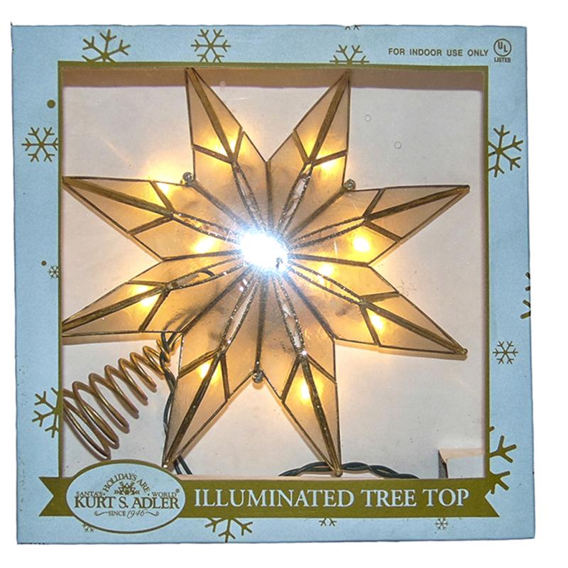 | This Kurt Adler 10-Light 8-Point Gold Capiz Star Treetop is a beautiful and unique addition to your Christmas tree décor. This 8-point star features gold glitter and gold edge detailing. | |