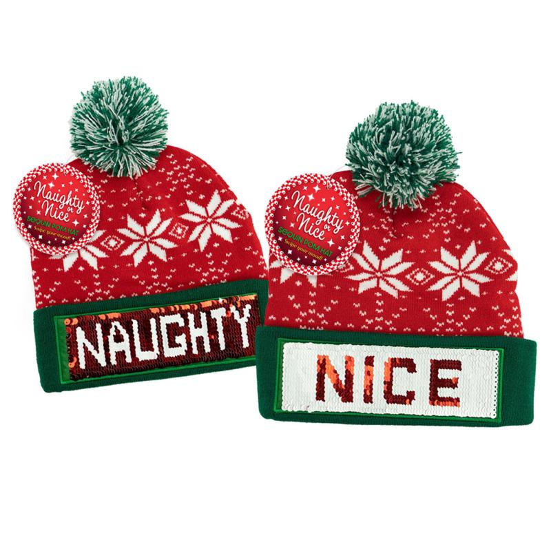 | These Naughty or Nice Sequin Pom Hats have a snowflake-patterned knit. They'll have an elfin' good time with this fun changeable pom hat! Perfectly layered sequins can be swiped either way to show "naughty" or "nice." Great for holiday outings, parties, and gifts! One size fits most people. |