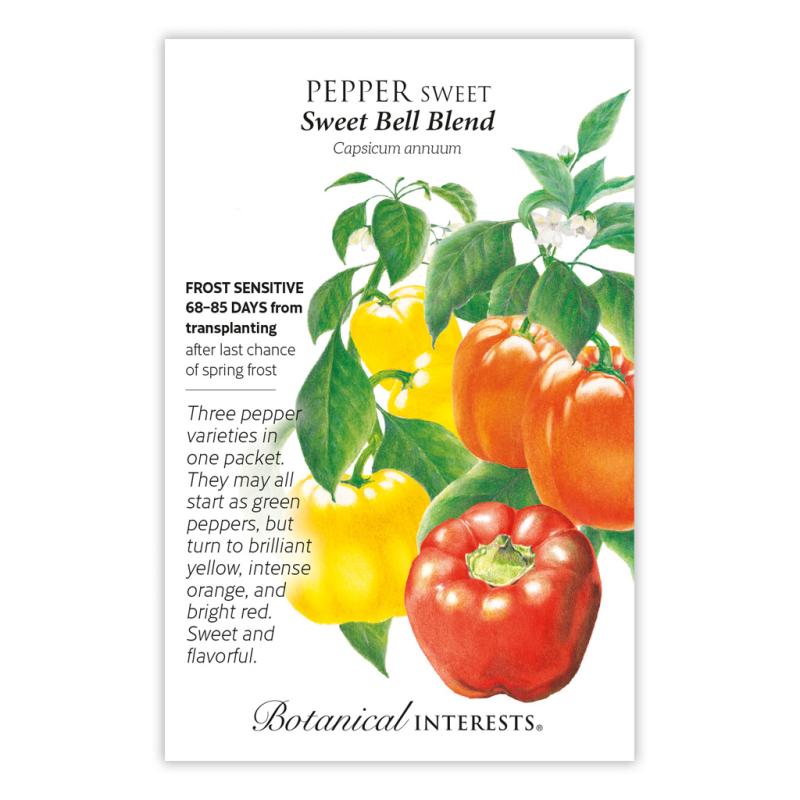 | All three of these delectable sweet peppers start out green and then sweeten as they transform into their ripe color, although delicious at any stage. Heirloom 'Yolo Wonder' (red color seeds) turns bright red and is resistant to tobacco mosaic virus. 'Coral Belle' (natural color seeds) turns intense orange, and 'Canary Belle' (yellow color seeds) turns a brilliant yellow. These 3½"–4" hefty peppers grow well in containers too. |