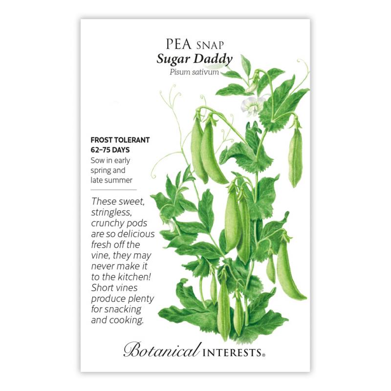 | Homegrown peas taste so much better than store bought peas! Like snap or green beans, pods and all are consumed! 'Cascadia' has 3" long, deep green, thick, juicy pods that are very flavorful. Serve raw with dip, steam, or stir fry. Short, 30" vines are self-supporting. Resists powdery mildew and pea enation virus, making it an excellent choice for late summer sowing as well. |
