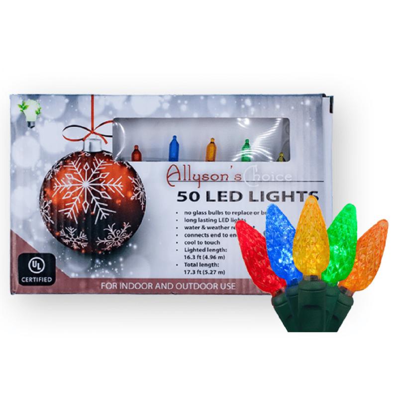 | The Allyson's Choice 50 multi-colored LED C6 faceted green wire light set with UL end connector is 16.5 inches long, with a bulb spacing of 4 inches, a 12-inch lead, and a 4-inch tail. You can connect up to 43 sets together. They are steady burning, cool to the touch, and can be used indoors or outdoors. |
