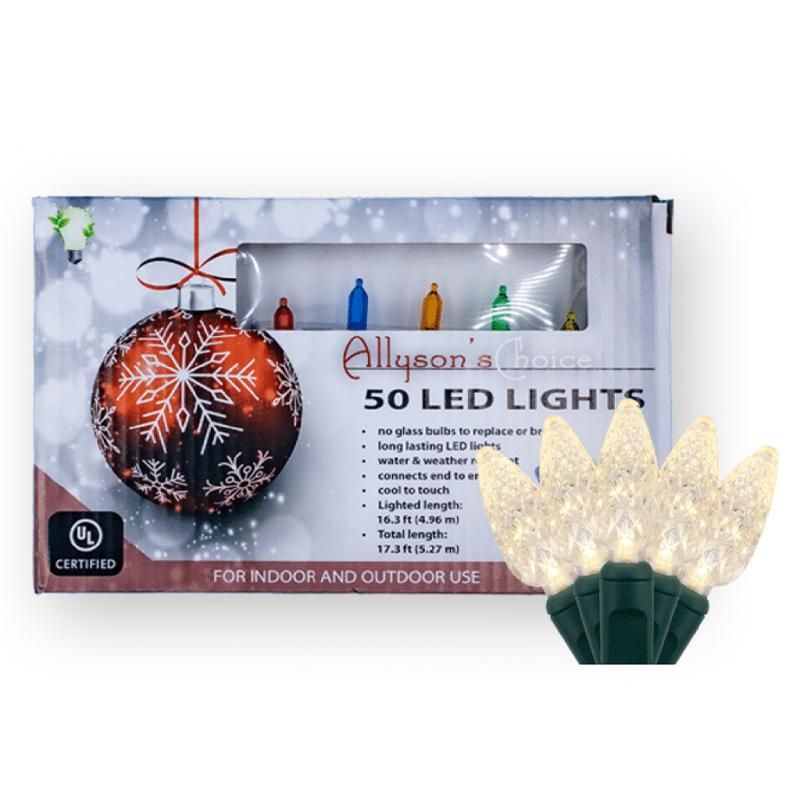 | The Allyson's Choice 50 warm white LED C6 faceted green wire light set with UL end connector is 16.5 inches long, with a bulb spacing of 4 inches, a 12-inch lead, and a 4-inch tail. You can connect up to 43 sets together. They are steady burning, cool to the touch, and can be used indoors or outdoors. |