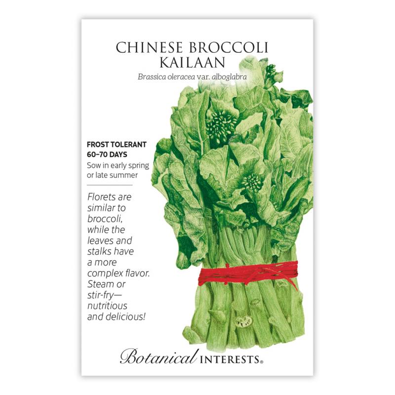 | Chinese broccoli, also called Chinese kale or gai lan, is widely used in Asian cuisine. The florets can be substituted for regular broccoli in many recipes. The leaves and juicy stems have a more complex flavor, sweet yet slightly bitter. Chinese broccoli is easy to grow and will tolerate heat better than many broccoli and kale varieties, so the harvest period is longer; expect lots of side shoots after the first harvest. High in calcium, iron, and vitamins A and C. Very popular for stir-fry dishes; it can also be steamed or boiled. For a gourmet treat, lightly sauté the thinned seedlings! |