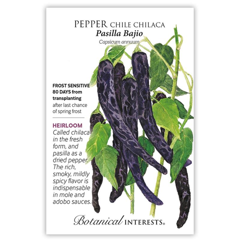 | Pasilla means "little raisin" in Spanish, referring to the dark brown, wrinkled, dried form of the chilaca pepper. Fresh chilaca adds depth to red enchilada sauce and salsas. The dried pod, or pasilla, is a flavorful and important ingredient in traditional mole sauce. 1,000–2,000 Scoville heat units (mild). Plants are tobacco mosaic virus resistant. |