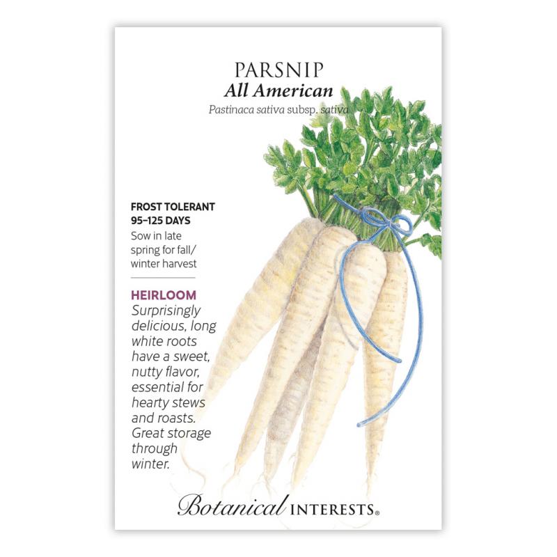 | All-American' parsnip thickens early, in as little as 95 days! Parsnips have a long culinary history, are versatile and nutritious and are being added to the menus of many upscale and specialty restaurants. Their tender, white, carrot-like roots have a sweet and distinctive flavor that's delicious in soups and stews, mashed, stir-fried or roasted. The trick to growing the sweetest parsnips? Wait to harvest until after the first frost. Cold temperatures change the starch into sugar making them sweeter. |