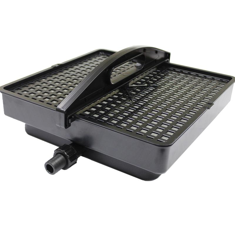 | A garden pond filter for ponds up to 1,000 gallons that can be used in conjunction with any submersible pump up to 1000 gph. Additional units can be added for higher capacities. Its unique handle serves as positive locking mechanism for the filter compartment and provides a convenient means of attaching a rope or pole to position or retrieve the filter in the pond. Also features a quick disconnect fitting which enables it to be easily attached or removed from the pump. Two reusable filtering media: coarse polyester for particle filtration and carbon-impregnated for chemical filtration. |