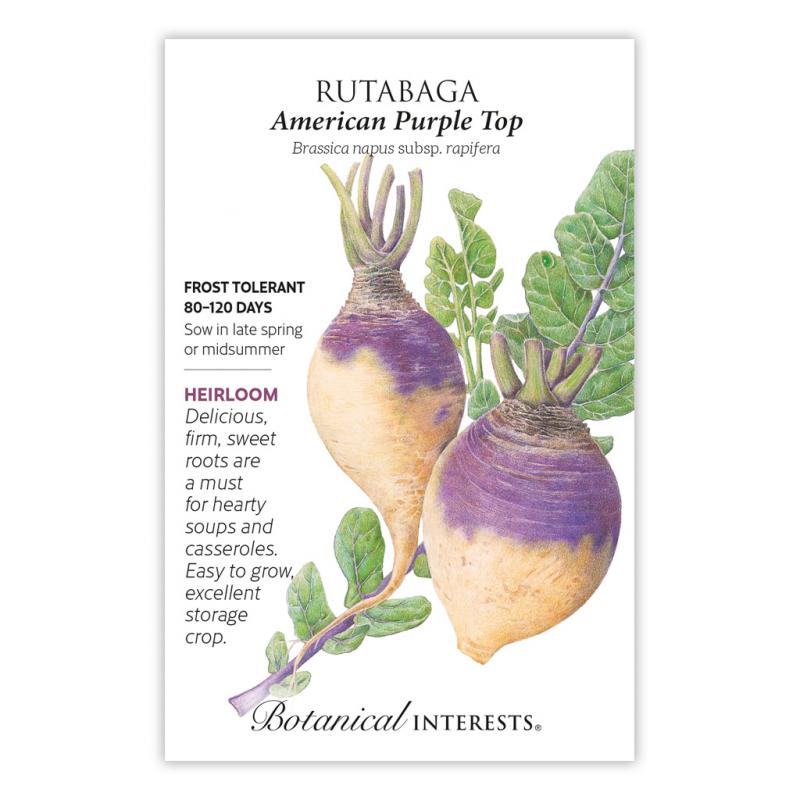 | Rutabaga, or swede, as the British call it, is a 4"-6" long root vegetable with a sweet, mellow flavor. Mash just like potatoes, add chunks to soups and stews, or bake in savory or sweet casseroles. Even the tops are edible and make tasty sautéed greens. Rutabagas develop the best flavor when harvested during cool weather, making an ideal fall crop in most places. A great storage crop. |