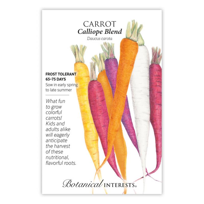 | Imagine the pleasure of pulling up purple, red, white, yellow, and orange carrots from the earth, so crisp and delicious from your own garden. Packed with vitamin A and other healthful nutrients, colored carrots have been around for more than 1,000 years! For gourmet baby carrots, harvest when only 3"-4" long. |