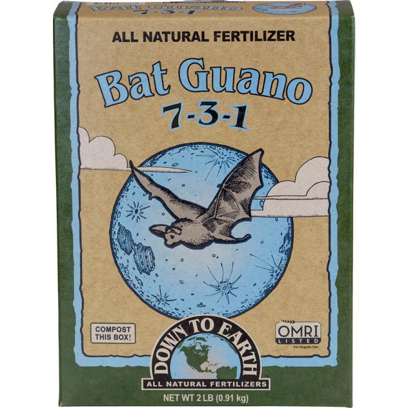Description: Down To Earth Bat Guano 7-3-1 Fertilizer is the undisputed champion of organic fertilizers. Bat Guano is rich in readily available nitrogen, phosphorus and micronutrients, and provides essential plant nutrition for vigorous vegetative growth and early fruit and flower development. Bat Guano is fast acting and highly effective when mixed into potting mediums, applied as a side dress or steeped to make a potent guano tea or foliar spray. OMRI List and CDFA Listed (Registered Organic Input Material).
