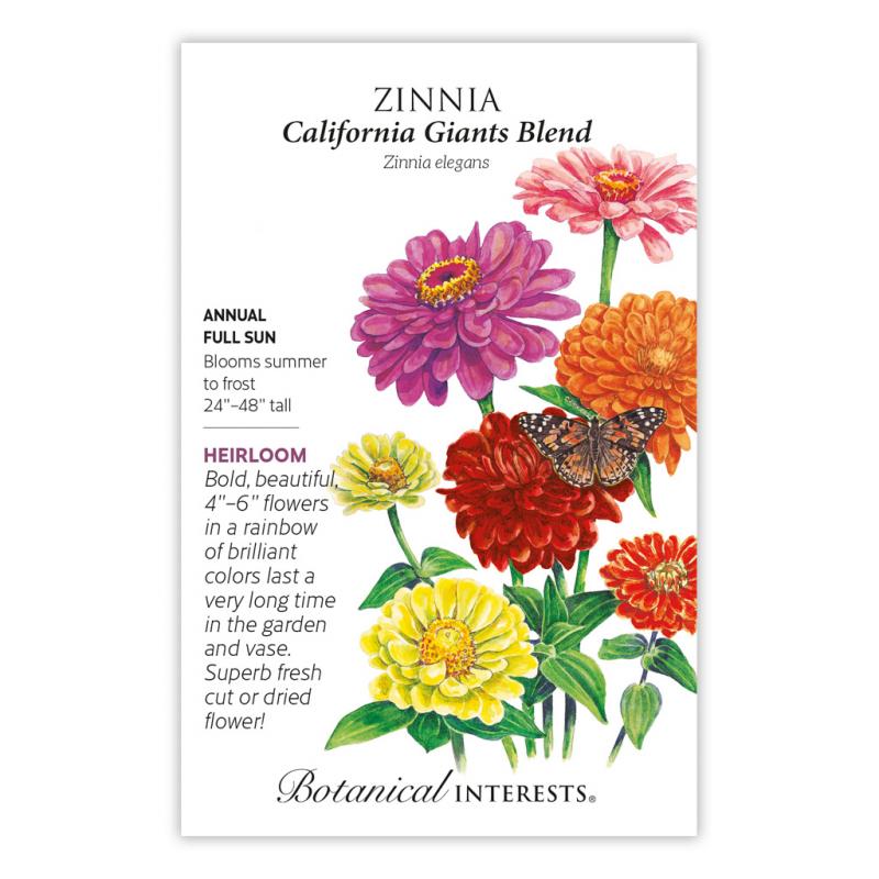 | Zinnias are a must for anyone wanting glorious, long-lasting colors throughout the garden, as well as for cut flower arrangements. The more you cut, the more they bloom! Since 1926, California Giants has delivered large blossoms on heat-loving, tall plants; stunning planted in a mass. Each individual flower lasts a very long time on the plant and in the vase. The edible, colorful flowers can make a pretty garnish to salads, desserts, cold drinks, or serving trays. Attracts pollinators. Deer resistant. |