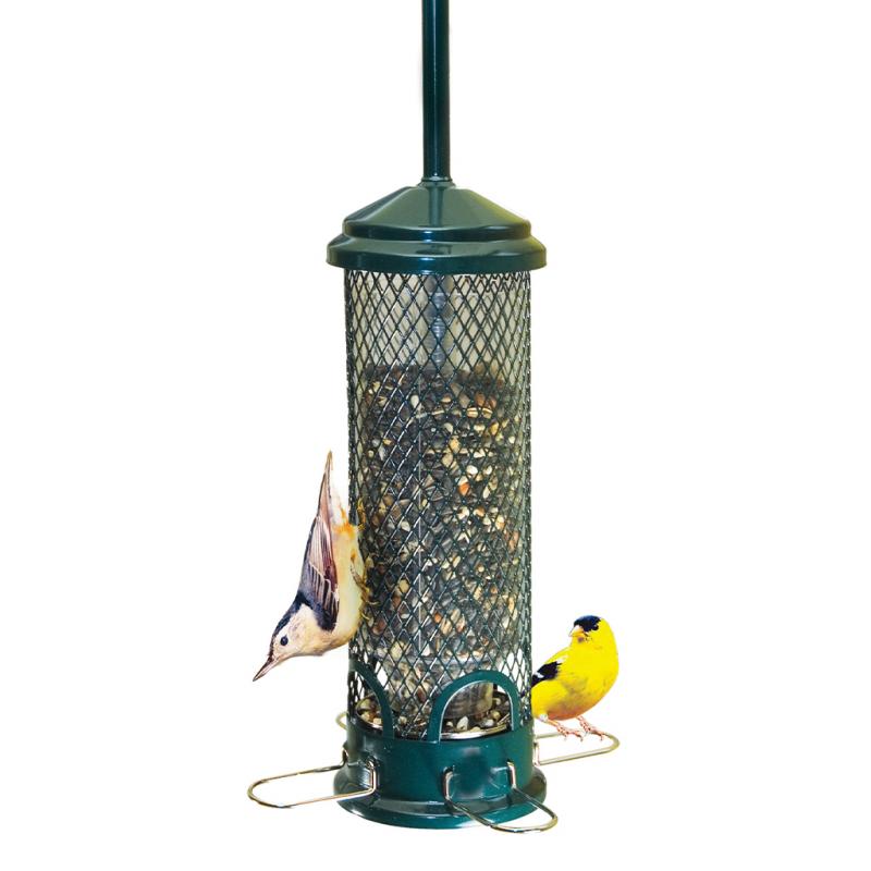 Description: The Squirrel Buster Mini is guaranteed to be squirrel proof. Openings in the bottom of the metal mesh shroud are aligned with the seed tray and allow birds access to the seed. When a squirrel climbs onto the feeder, its weight automatically forces the shroud down, closing the seed ports. 1 lb. seed capacity. 4 seed ports.
