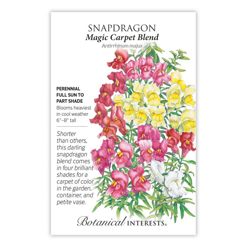 | If you love "snaps" you'll want to grow this dwarf variety of the old garden favorite. With a lovely combination of colors, it adds charm when planted with other low-growing annuals in flower beds and borders. The perfect size for containers, or even hanging baskets, and attract pollinators. The edible flowers with their unique shape make an interesting and pretty garnish on salads, desserts, and cold drinks. Snaps do best in cool weather. A good cut flower for your petite bouquet. |