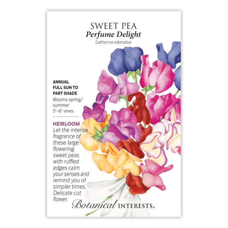 | The exquisite fragrance of these large, ruffled flowers harks back to days of grandmother's garden. Bring the luscious aroma into your home in cut flower bouquets. This rainbow blend includes purple, red, rose, scarlet, white, blue, cream, and some bicolors. More heat resistant than other sweet peas. Caution: Parts of this plant are toxic if ingested. |