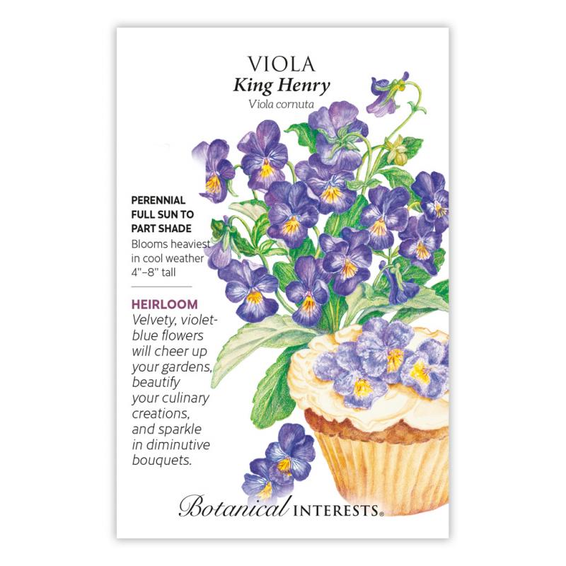 | With its royal color, 'King Henry', (formerly called 'Prince Henry') delivers little mounds of beauty to your garden and containers. Violas love the cool weather of spring and fall, making them ideal for spring bulb cover, and for fall color after annuals are spent. In mild climates, they cheerfully bloom through the winter. Use the edible petals to garnish soft cheese or baked goods. |