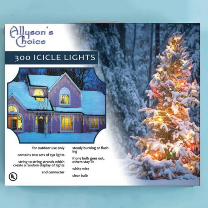 Description: The Icicle 300 Curtain Light, a white wire set, has 300 steady burning lights, consisting of 2-150 clear UL icicle curtain light sets totaling 26 feet. There are 27 drops between the two sets with 6-inch spacing between drops and 4-inch bulb spacing; there is a 6-inch lead with a 3.5-inch tail. You can connect up to three 150 light sets (450 lights total)