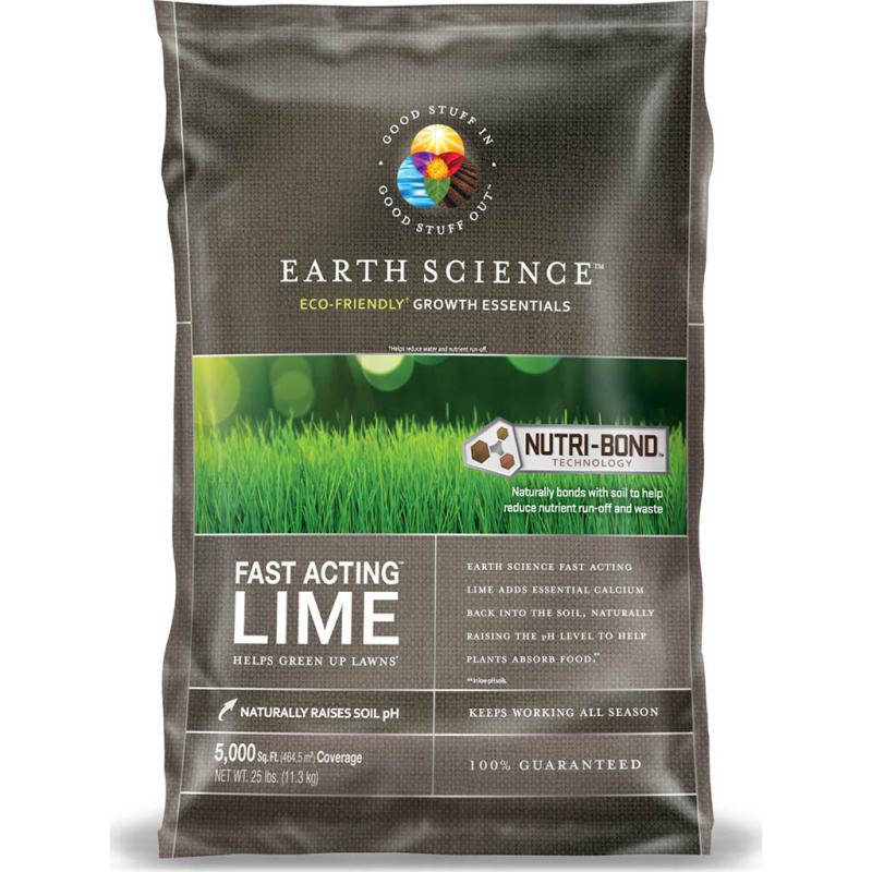 Description: Earth Science Fast Acting Lime adds essential calcium back into the soil, naturally raising the pH level to help plants absorb food. Helps green up lawns. Keeps working all season. Contains Earth Science's patented Nutri-Bond Technology, which naturally bonds with soil to help reduce nutrient run-off and waste. It is the result of years of research into methods of reducing fertilizer run-off and waste. Nutri-Bond naturally bonds with the soil to help keep more product where you put it. That's better for the environment and helps your lawn get the most out of every application. GOOD STUFF IN-GOOD STUFF OUT.