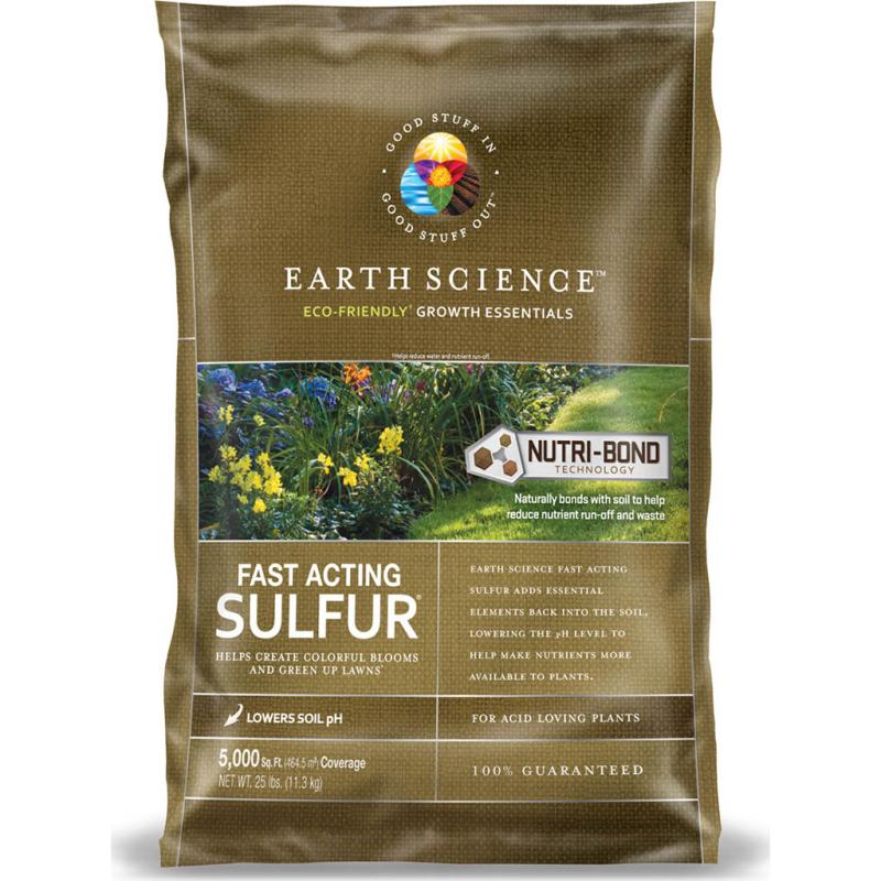 | Earth Science Fast Acting Sulfur adds essential elements back into the soil. It starts working immediately to lower the pH level of your soil to help make nutrients more available to plants, and improve fertilizer effectiveness. Helps create colorful blooms and a lush green lawn. Good for acid loving plants. Contains Earth Science's patented Nutri-Bond Technology, which naturally bonds with soil to help reduce nutrient run-off and waste. It is the result of years of research into methods of reducing fertilizer run-off and waste. Nutri-Bond naturally bonds with the soil to help keep more product where you put it. That's better for the environment and helps your lawn get the most out of every application. GOOD STUFF IN-GOOD STUFF OUT. |