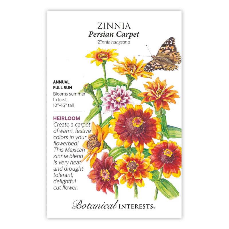 | Persian Carpet, also called Mexican zinnia or narrow-leaved zinnia, is a reliable choice for beds, borders, and containers. With bicolored single and double flowers in gold, burgundy, cream, red, and orange, it will bloom throughout hot, dry summer weather until first frost. It has smaller, narrower leaves and a more bushy, compact habit than common zinnia (Z. elegans). Delightful as a cut flower; attracts pollinators, too! Zinnias are edible, but have little flavor. The colorful flowers can make a pretty garnish to salads, desserts, cold drinks, or serving trays. (The flower's central disk, while edible, can be bitter.) 1952 All-America Selections winner. |