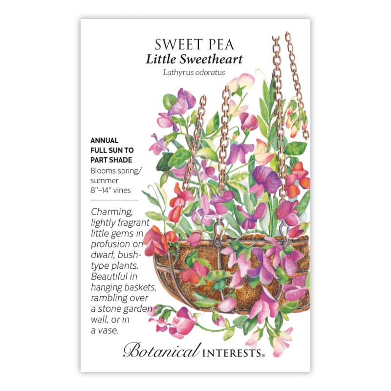 | Little Sweetheart is not your usual vining, climbing sweet pea, but a dwarf, bush type with profuse, lightly scented, small flowers in red, pink, white, rose, purple, lilac, and blue. Try something different for hanging baskets, patio containers, window boxes or the front of a border.Caution: Parts of this plant are toxic if ingested. |