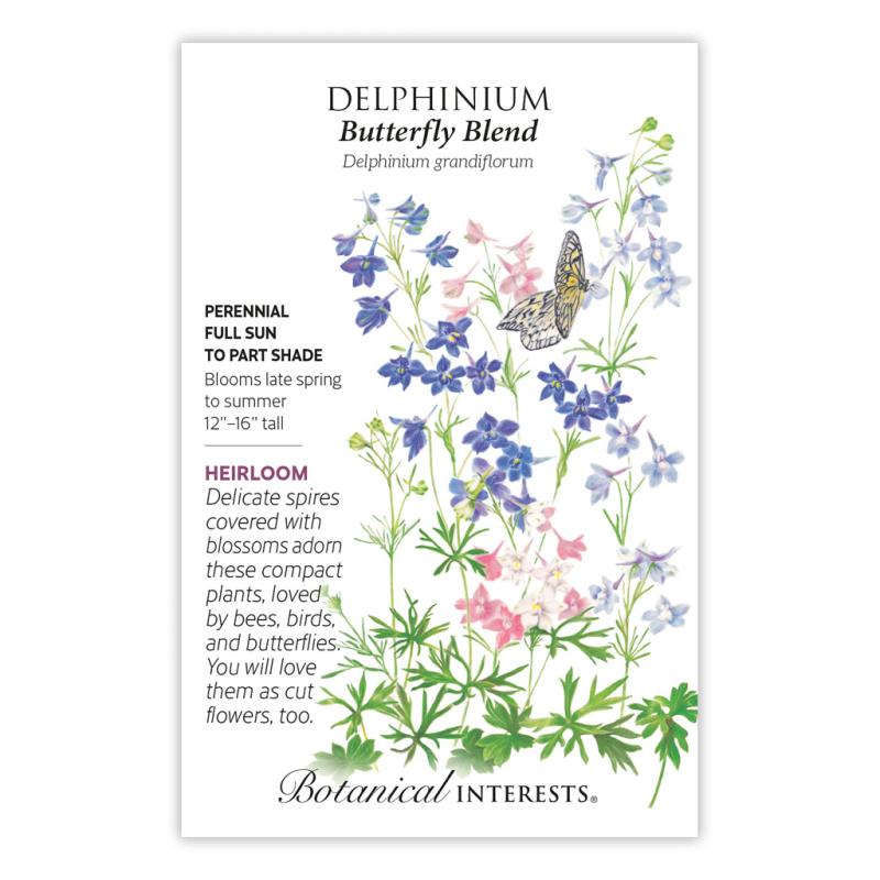 | This charming blend of dwarf delphiniums performs better in the heat than others, and is an excellent choice for small spaces, or as an accent in the border or cottage garden. Prolific plants will bloom the first year, producing marine blue, light blue, soft rose, or white flowers. Grows well in containers and spots where the wind might topple taller varieties. Unlike traditional delphiniums, the dwarf type is a native of China, first introduced to England in 1818. |